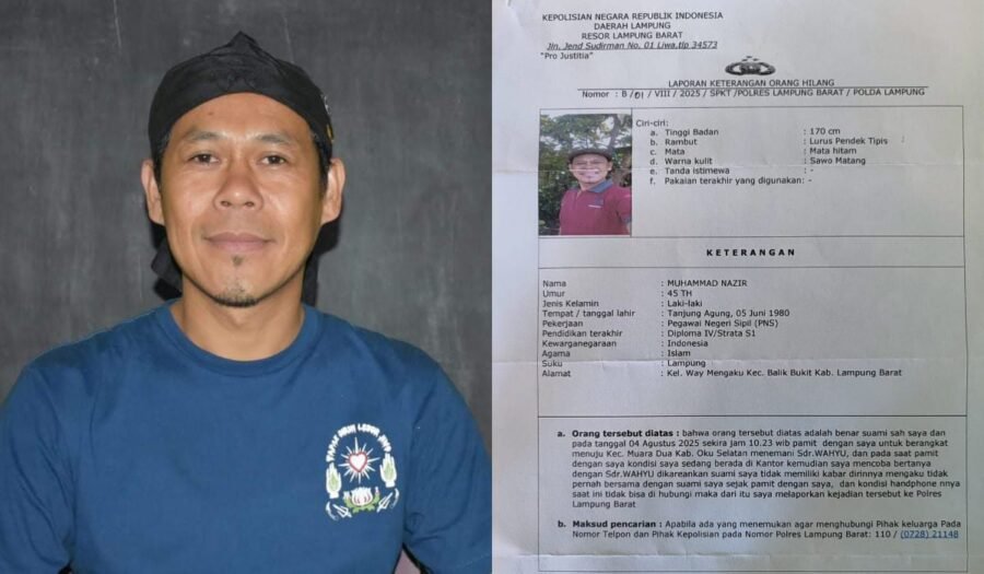 Lampung Barat (Netizenku.com): Nazir dilaporkan belum kembali ke rumah sejak berpamitan kepada istrinya, Neli Kusuma, pada Minggu 4 Agustus 2025 sekira pukul 10.23 WIB. Saat itu, ia mengatakan akan pergi ke Kecamatan Muara Dua, Kabupaten Ogan Komering Ulu (OKU) Selatan, bersama rekannya bernama Wahyu. Namun hingga kini, ia belum kembali dan tidak dapat dihubungi.