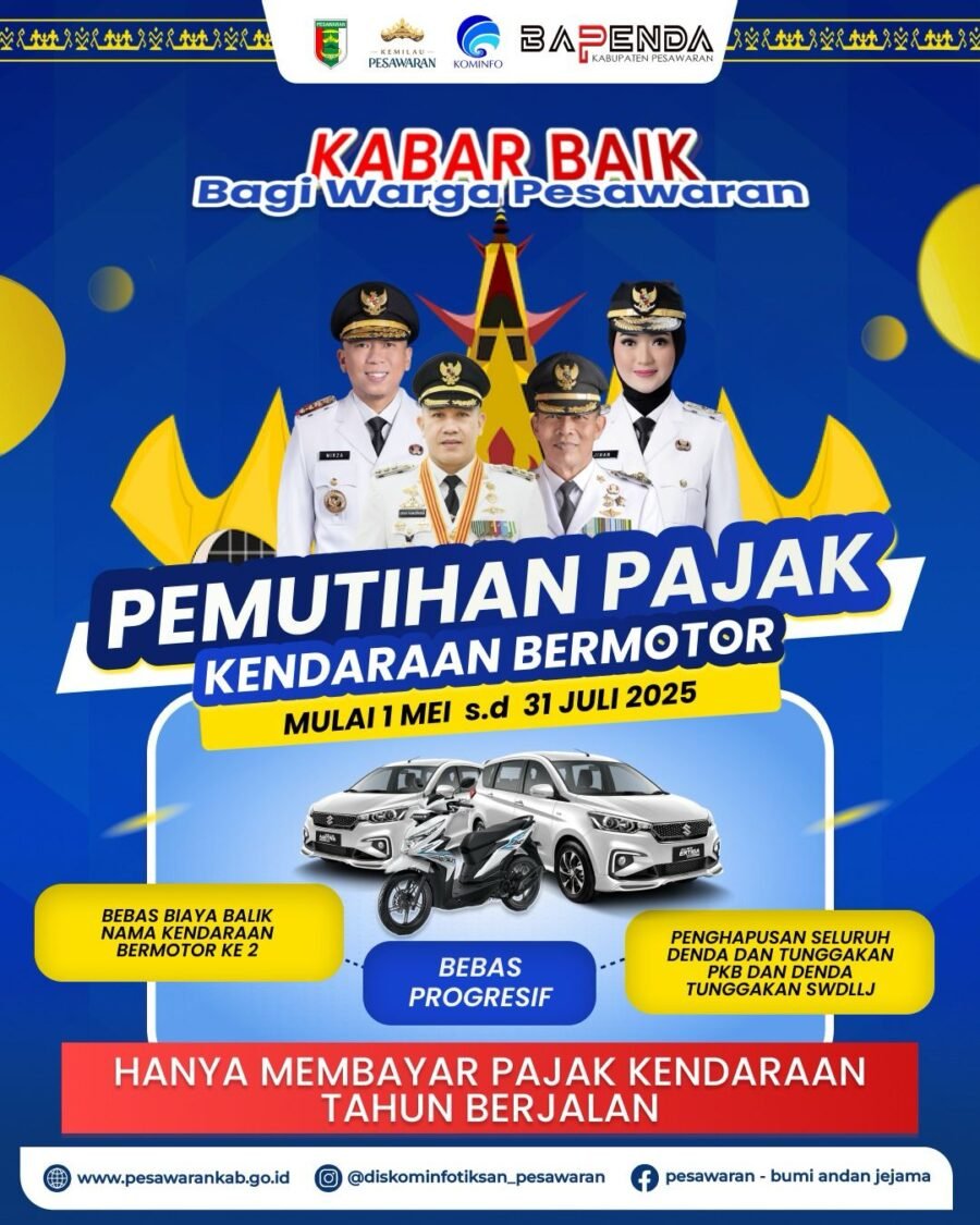 Kepala Badan Pendapatan Daerah (Bapenda) Kabupaten Pesawaran, Evans Saggita, mengajak masyarakat untuk memanfaatkan program pemutihan pajak kendaraan bermotor yang akan berlangsung mulai 1 Mei hingga 31 Juli 2025 mendatang.