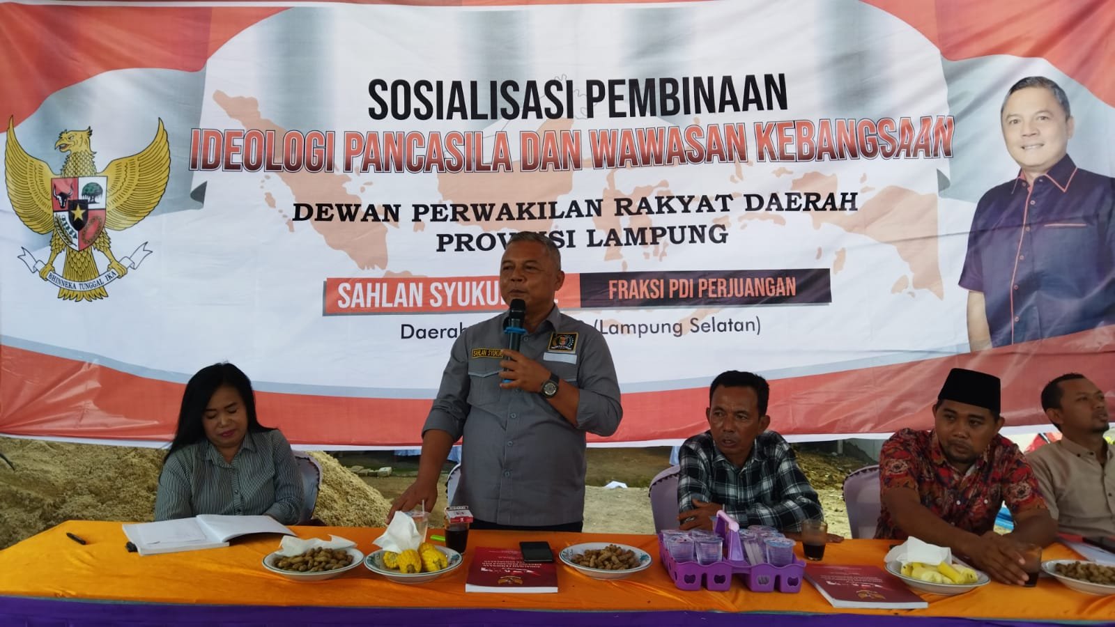 Lampung Selatan (Netizenku.com): Anggota Dewan Perwakilan Rakyat Daerah (DPRD) Provinsi Lampung, Sahlan Syukur, menggelar sosialisasi pembinaan Ideologi Pancasila dan Wawasan Kebangsaan (IPWK) di Desa Bulok, Kecamatan Kalianda, Lampung Selatan, Jumat (8/7).