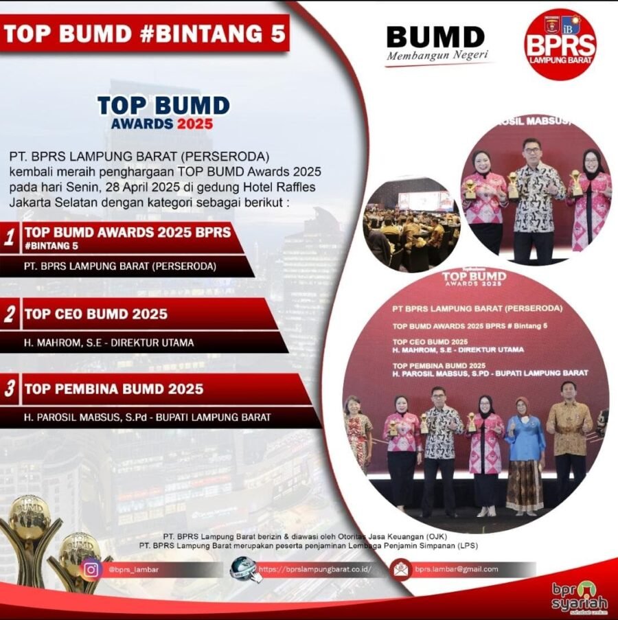 “Alhamdulillah, PT BPRS Lampung Barat meraih tiga penghargaan sekaligus: TOP BUMD Awards 2025 Bintang 5, TOP CEO BUMD 2025 untuk saya selaku Direktur Utama, dan TOP Pembina BUMD 2025 yang diberikan kepada Bupati Parosil Mabsus,” kata Mahrom.