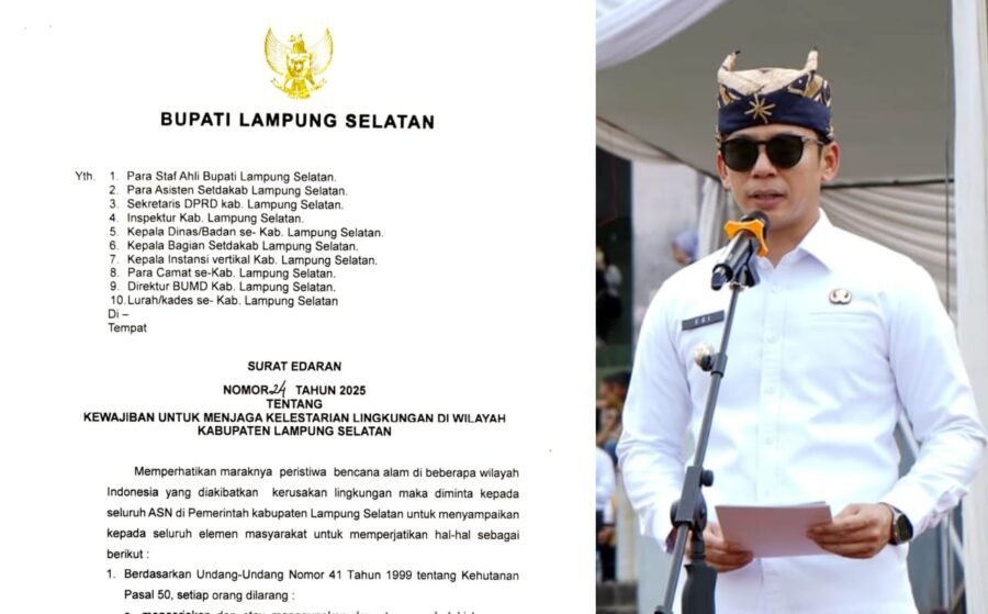 Bupati Lampung Selatan Radityo Egi Pratama menerbitkan Surat Edaran Nomor 24 Tahun 2025 tentang kewajiban menjaga kelestarian lingkungan hidup di wilayah Kabupaten Lampung Selatan. Surat edaran tersebut dikeluarkan pada 22 Desember 2025.