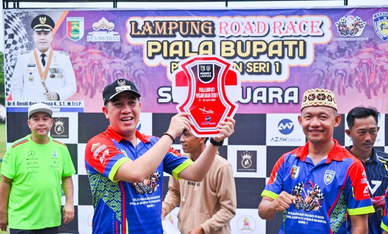 Pesawaran (Netizenku.com): Bupati Dendi Ramadhona, menyerahkan piala kepada para juara pada kejuaraan Road Race Lampung Piala Bupati Pesawaran Seri 1 Tahun 2024 di Komplek Pemkab setempat, Minggu (28/4/2024).