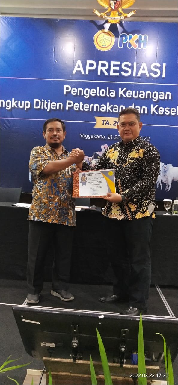 Penyerahan Penghargaan oleh Dirjen PKH yg diwakili oleh Koordinator Keuangan dan Perlengkapan, Drh. Nursapto Hidayat pada kegiatan Apresiasi Pengelolaan Keuangan Lingkup Ditjen Peternakan dan Kesehatan Hewan, Kementerian Pertanian di Yogyakarta, 21 – 23 Maret 2022.