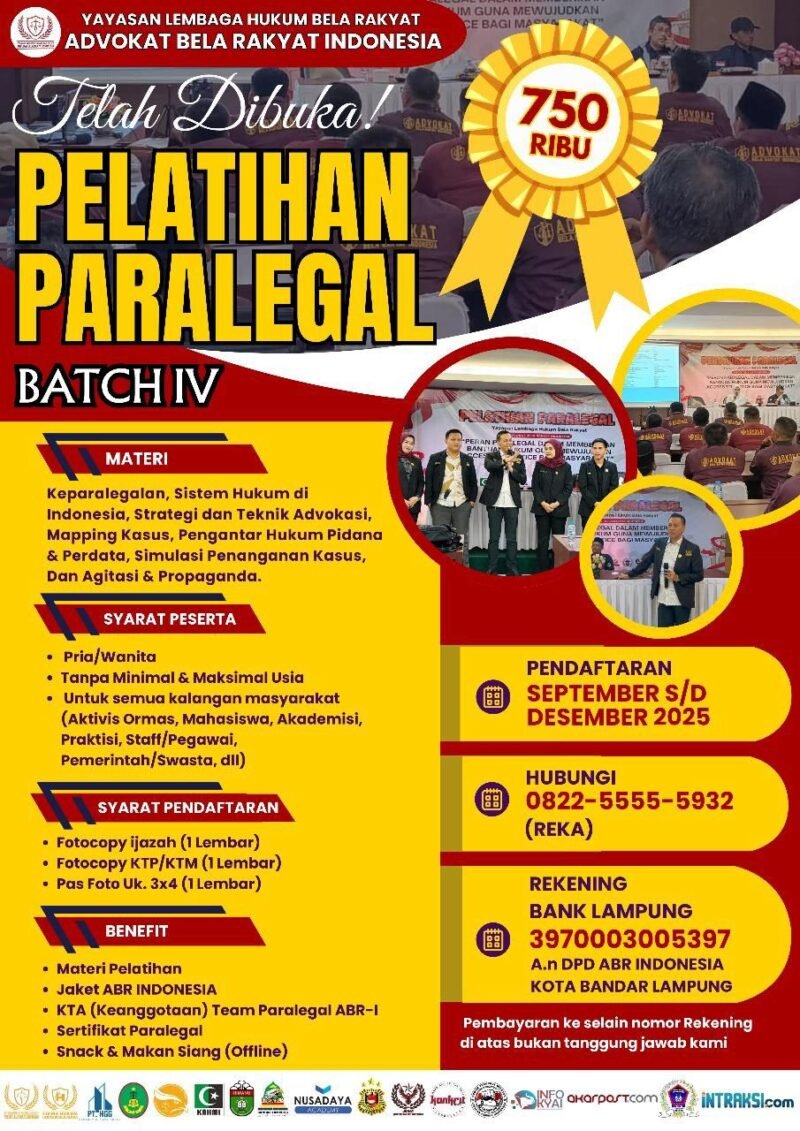 Dewan Pengurus Pusat (DPP) Advokat Bela Rakyat Indonesia (ABRI) kembali menggelar Pelatihan Paralegal Nasional yang dijadwalkan berlangsung pada Desember 2025.