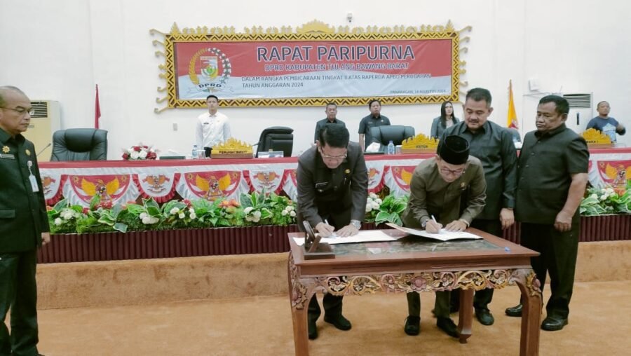 Penjabat Bupati Tubaba M. Firsada, dan Ketua DPRD Tubaba Ponco Nugroho,  menandatangani Nota Kesempatan pengesahan APBD Perubahan Kabupaten Tubaba tahun anggaran 2024 dalam rapat paripurna di Gedung DPRD, Rabu sore (14/8/2024). (Arie/NK)