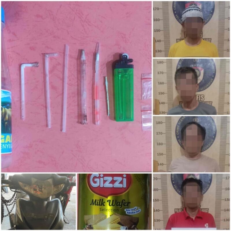 Selain menangkap keempat terduga pelaku, polisi juga mengamankan sejumlah barang bukti, di antaranya satu tabung kaca pirek berisi residu sabu, satu alat hisap (bong) dari botol bekas, tiga selang pipet, satu sendok sabu, satu sumbu pembakar, satu korek api gas, tiga bungkus plastik klip kecil kosong, satu kaleng aluminium merek Gizzi warna kuning, dan satu unit sepeda motor Honda Revo warna biru.