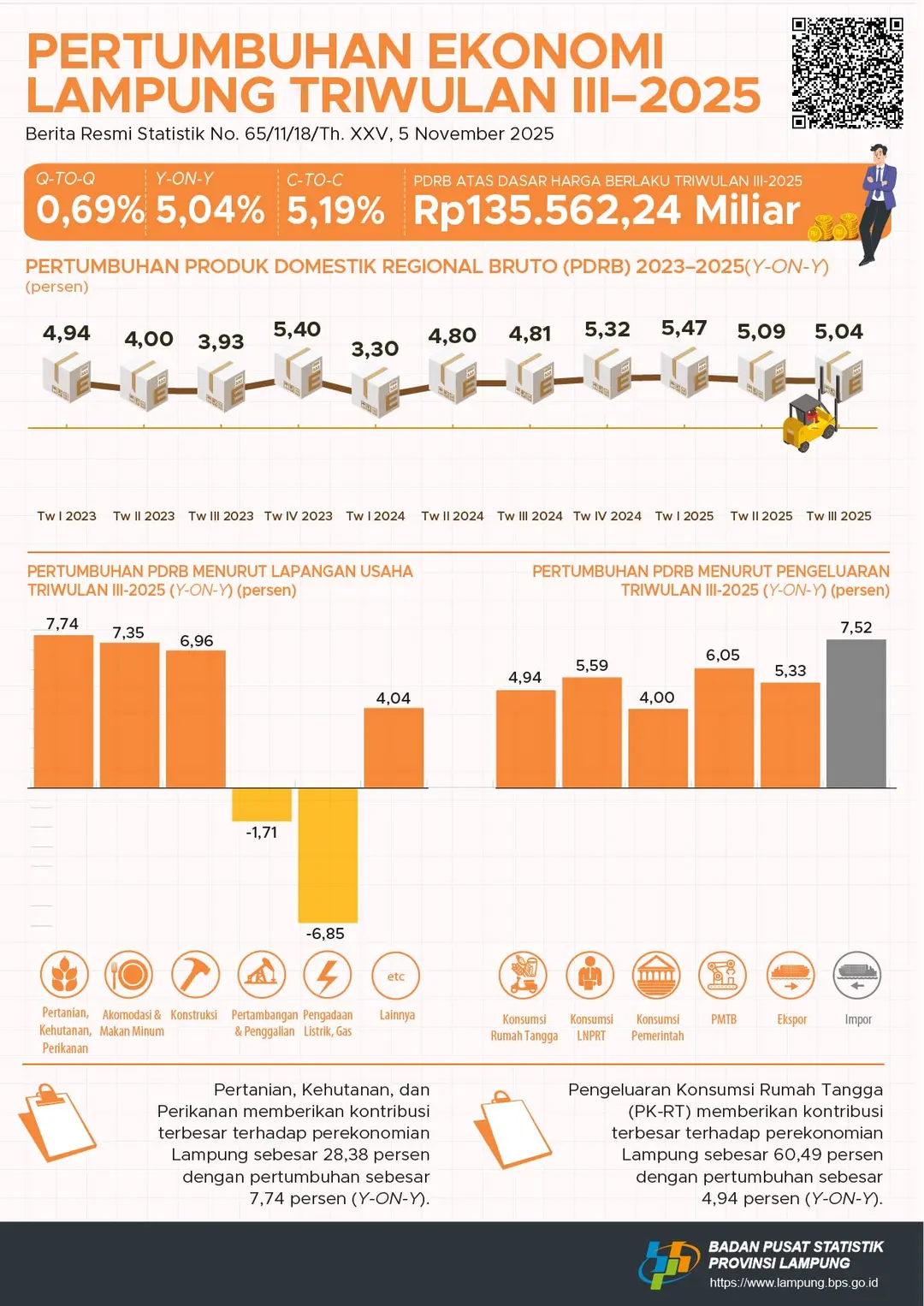 BANDARLAMPUNG — Perekonomian Provinsi Lampung pada Triwulan III 2025 tumbuh sebesar 5,04 persen (y-on-y). Meski sedikit melambat dibanding Triwulan II (5,09 persen) dan Triwulan I (5,47 persen), capaian ini menegaskan daya tahan ekonomi daerah yang tetap positif di tengah tekanan global dan fluktuasi harga komoditas.