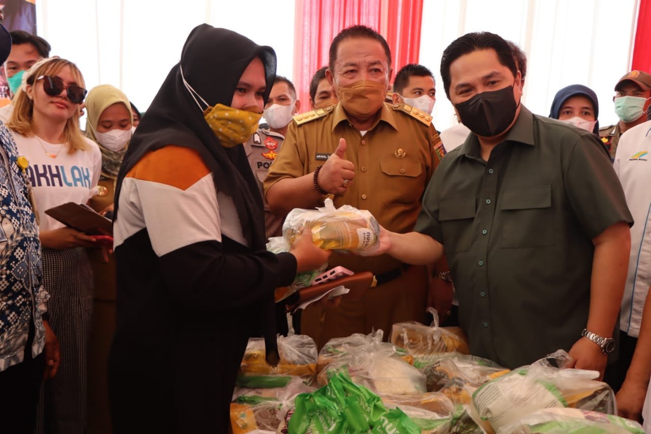 Erick Thohir menyampaikan bahwa pasar murah ini digelar sebagai bentuk perhatian pemerintah pusat dan BUMN dalam membantu masyarakat yang membutuhkan bahan pokok.