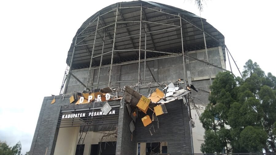 Suasana mendadak panik saat bagian depan Gedung DPRD Kabupaten Pesawaran runtuh secara tiba-tiba, Jumat (23/5/2025) sekira pukul 13.00 WIB. Meski cuaca cerah tanpa hujan maupun angin kencang, ornamen bangunan yang menjadi ciri khas kantor wakil rakyat itu ambruk dan nyaris menimbulkan korban jiwa.