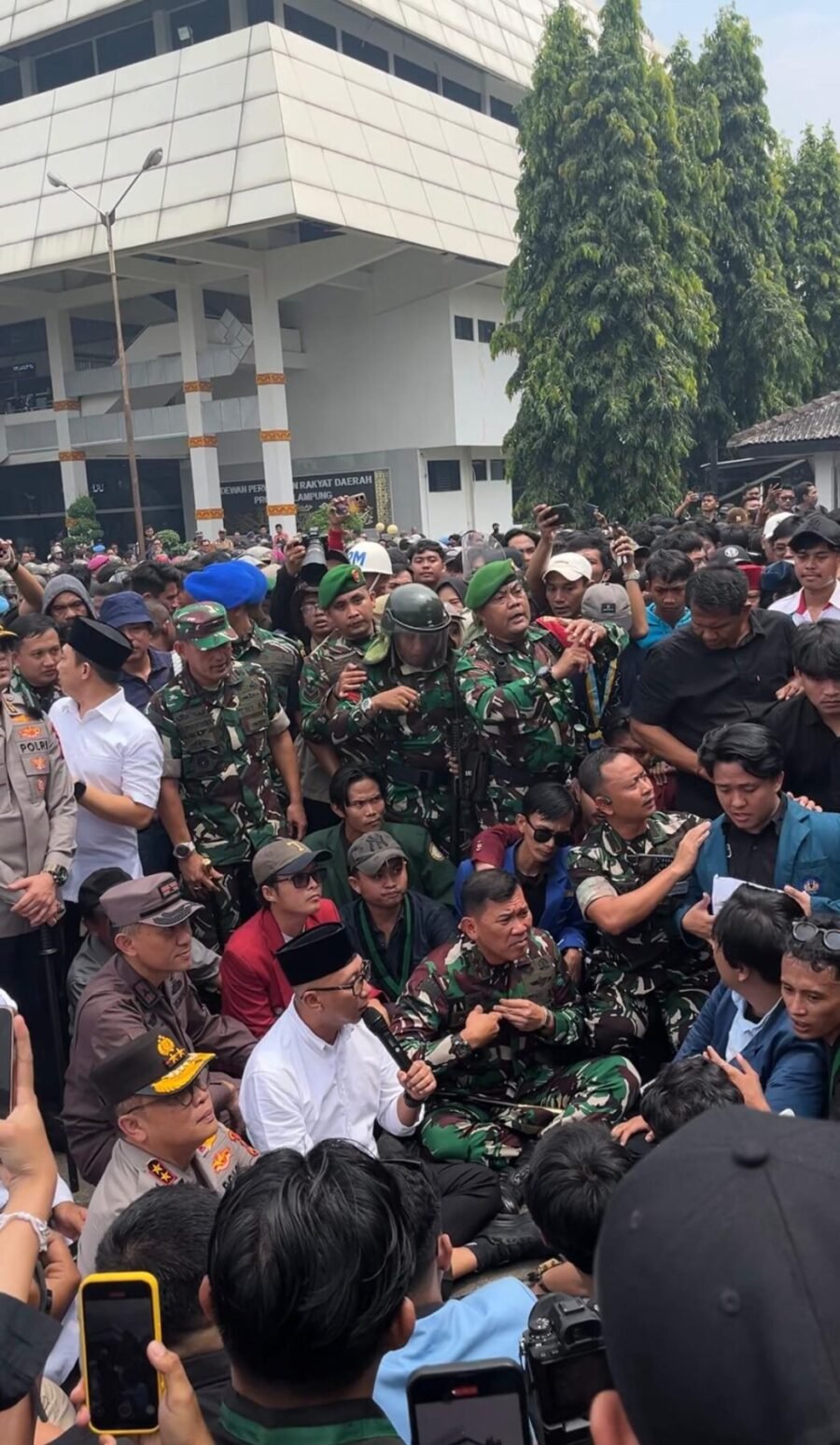 Menanggapi hal itu, Gubernur Lampung Rahmad Mirzani Djausal bersama Forkopimda, Ketua DPRD Provinsi Lampung Ahmad Giri Akbar, Kapolda Lampung Irjen Pol Helmy Santika, serta Pangdam II/Sriwijaya Mayjen Kristomei Sianturi turun langsung menemui massa.
