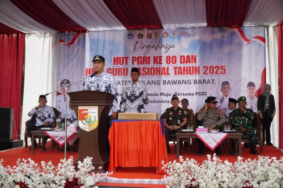 Pemerintah Kabupaten Tulangbawang Barat (Tubaba) menggelar Upacara Peringatan Hari Persatuan Guru Republik Indonesia (PGRI) dan Hari Guru Nasional (HGN) ke-80 Tahun 2025 di Lapangan Marga Kencana, Kecamatan Tulangbawang Udik, Selasa (25/11/2025).