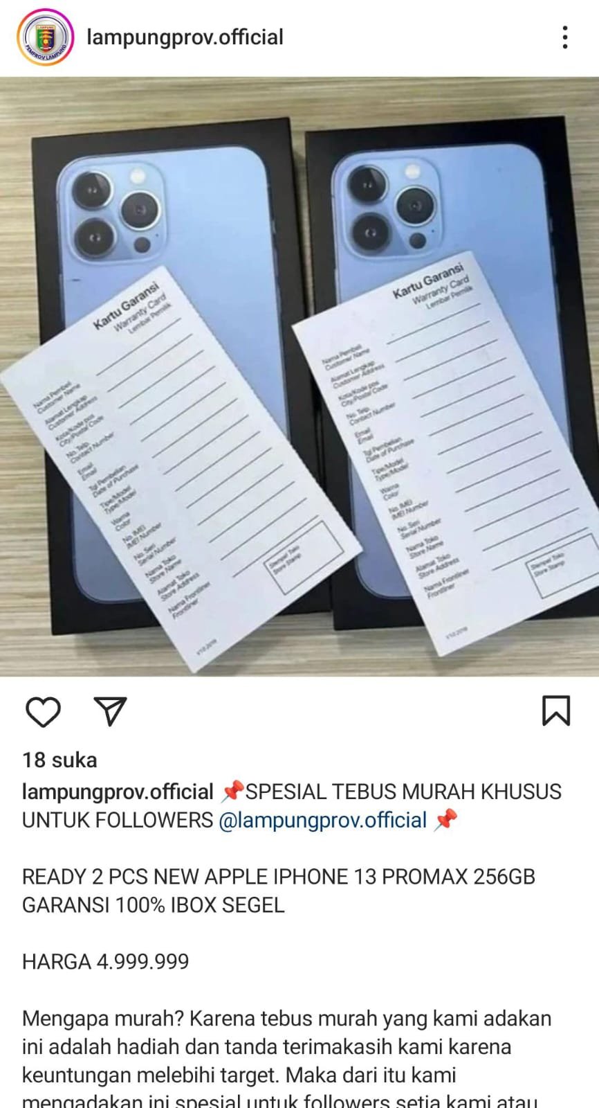 Bandarlampung (Netizenku.com): Akun Instagram resmi Pemerintah Provinsi Lampung dengan nama pengguna @Lampungprov.official diretas oleh pihak yang tidak bertanggung jawab. Peretas memanfaatkan akun tersebut untuk menjual smartphone iPhone 13 Pro Max dengan harga miring.