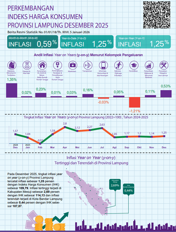 Secara bulanan, inflasi Desember 2025 sebesar 0,59 persen mencerminkan tekanan musiman akhir tahun, terutama dari pangan dan bahan bakar. Namun secara kumulatif, inflasi year to date yang juga berada di angka 1,25 persen menunjukkan bahwa sepanjang 2025 Lampung relatif berhasil menahan gejolak harga.