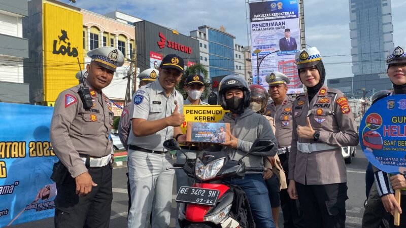 “Alhamdulillah, hari ini Jasa Raharja bersama Polresta Bandarlampung melaksanakan gebyar operasi keselamatan dan berlokasi di Tugu Adipura Bandarlampung. Di sini kami membagikan helm dan bingkisan kepada pengendara kendaraan bermotor yang menaati peraturan lalu lintas,” ujar Kepala Jasa Raharja Lampung, M Zulham Pane.