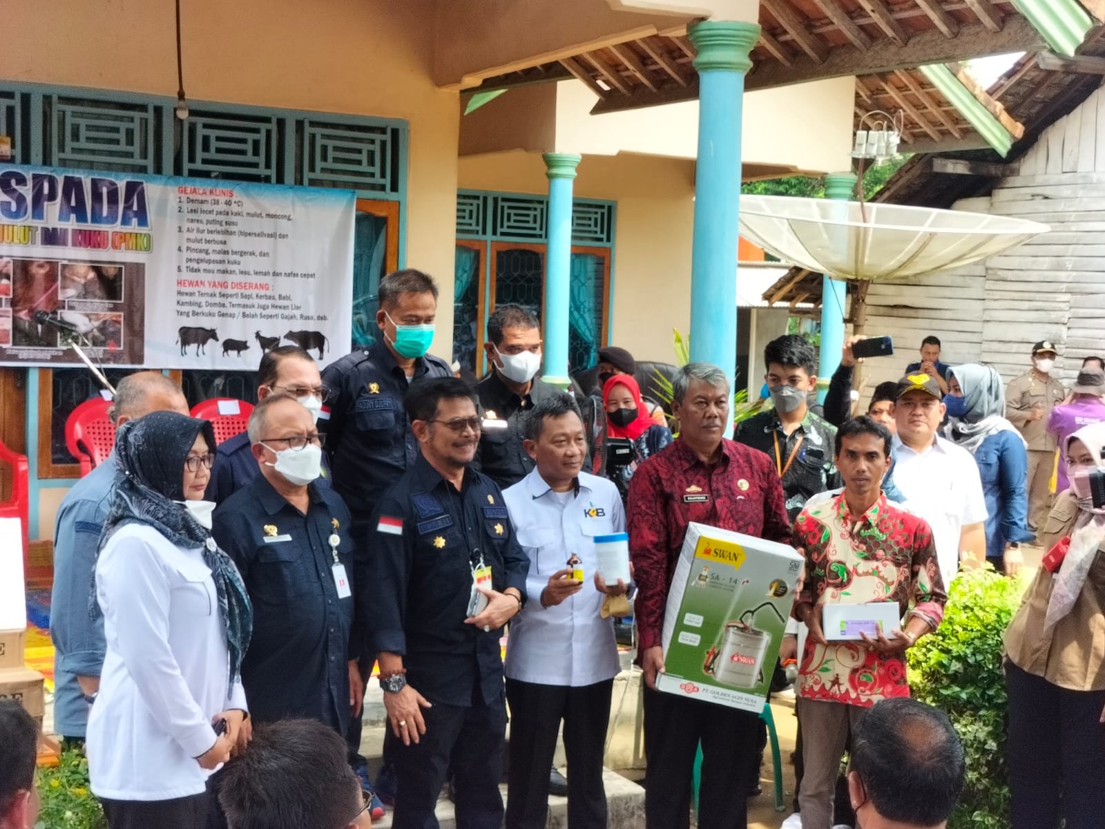 Selain meninjau lokasi peternakan, Mentan RI Prof. DR Syahrul Yasin Limpo juga menyerahkan obat-obatan hewan untuk memberantas PMK, disinfektan, dan Alat Pelindung Diri (APD). (Arie/Leni)