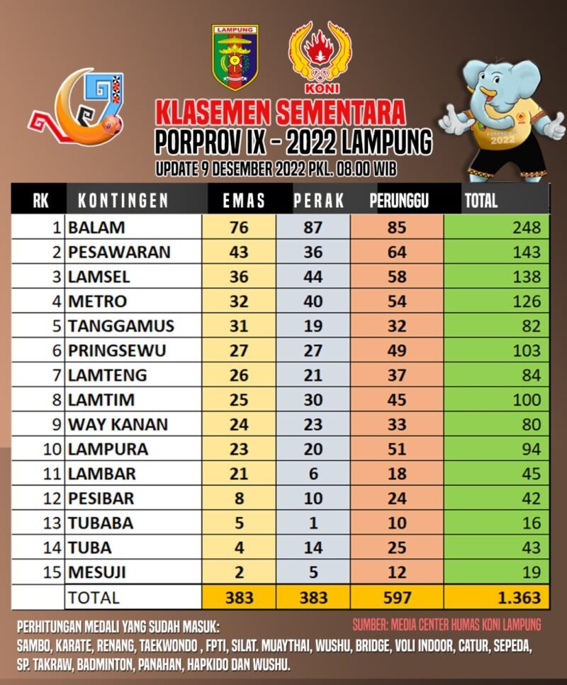 Dengan mengantongi 76 emas, 87 perak, dan 85 perunggu, kontingen Bandarlampung pimpin puncak klasemen sementara Porprov Lampung. Disusul oleh kontingen Pesawaran yang duduki posisi ke 2, dan kontingen metro pada posisi ke 3.