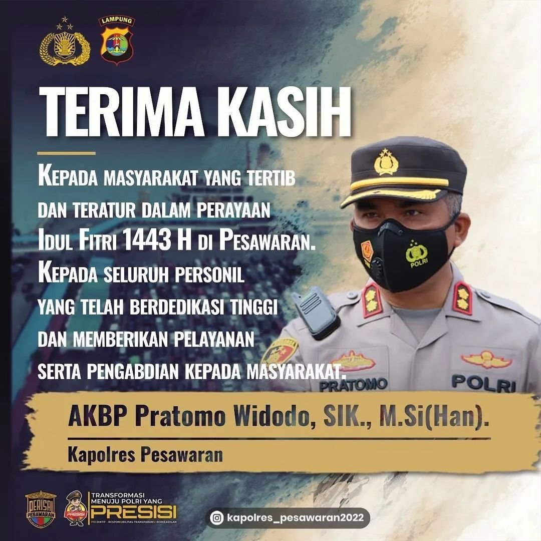 Pesawaran (Netizenku.com): Kapolres Pesawaran AKBP Pratomo Widodo, menyampaikan ucapan terimakasih dan apresiasi kepada masyarakat di Kabupaten setempat atas tertib dan teraturnya dalam perayaan Idul Fitri 1443 H 2022 M.
