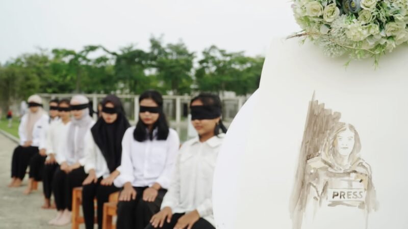 “Dari 12 performer perempuan duduk di atas bangku kayu selama satu jam, mata mereka ditutup dengan kain hitam sedangkan dua orang pemain pemusik menggesek biola dengan nada menyayat hati,” ungkap koordinator acara Solidaritas Tubaba untuk Jurnalis Shireen Abu Akleh, John Heryanto.