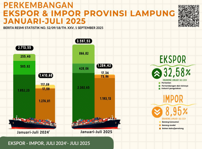 Provinsi Lampung mencatat prestasi ekonomi yang membanggakan sepanjang 2025. Neraca perdagangan provinsi ini tetap surplus, dengan nilai ekspor Januari–Juli menembus US$3,6 miliar, meningkat 32,6 persen dibanding periode yang sama tahun sebelumnya. Lonjakan ekspor ini didorong oleh sektor pertanian dan industri pengolahan, dengan kopi, teh, dan rempah-rempah sebagai produk unggulan. Sektor industri pengolahan juga mencatat pertumbuhan signifikan, menunjukkan bahwa Lampung tidak hanya menjadi produsen bahan mentah, tetapi juga mulai menonjol sebagai pusat produk bernilai tambah.