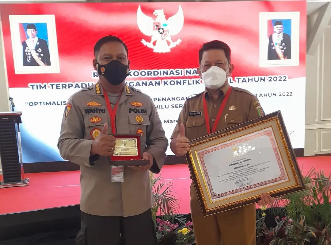 Kaban Kesbangpol Provinsi Lampung, M Firsada dan Kepala Biro Operasi (Karo Ops) Polda Lampung, Kombes Wahyu Bintono Hari Bawono, menerima penghargaan mewakili Provinsi Lampung.(rls)