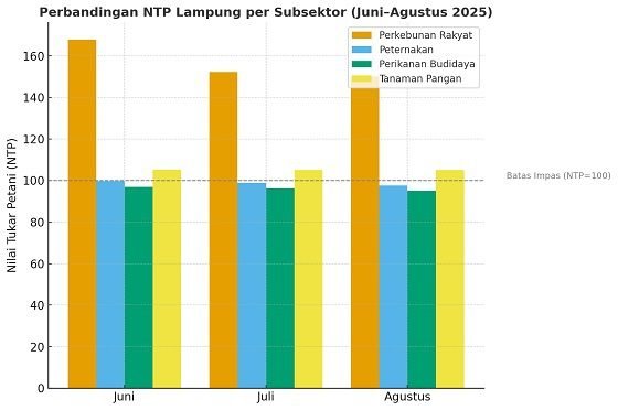 Dari grafik batang di atas menunjukkan perbandingan NTP Lampung per subsektor (Juni–Agustus 2025). Terlihat jelas perkebunan jauh di atas subsektor lain, sementara peternakan dan perikanan budidaya justru merugi karena terus di bawah batas impas NTP=100