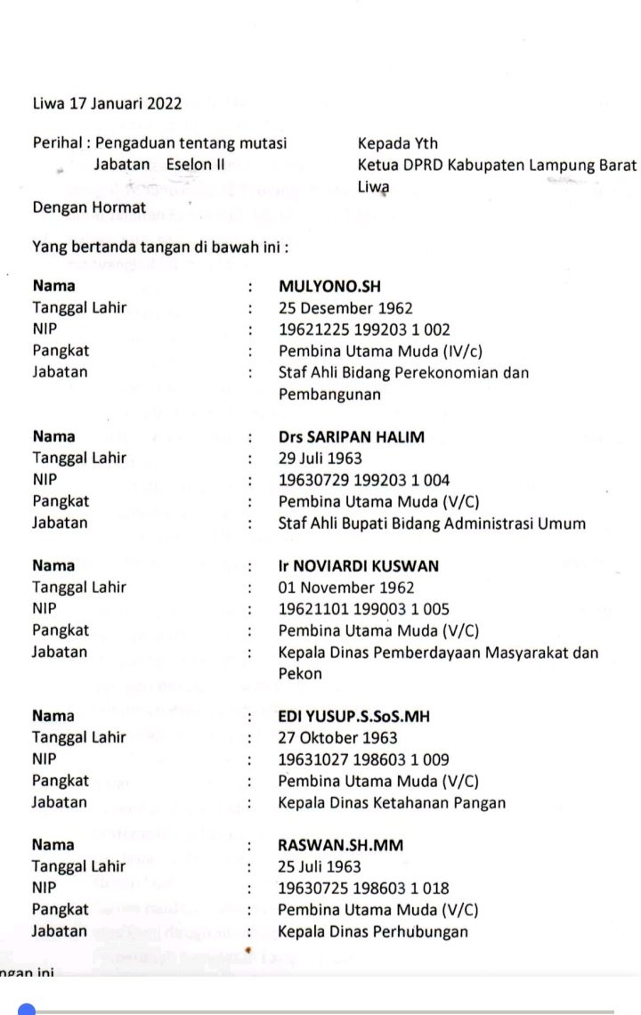 Terkait hal tersebut, ke lima pejabat yang memiliki pangkat IV C, yakni Mulyono staf ahli bupati bidang Perekonomian dan Pembangunan, Saripan Halim staf ahli bupati bidang Administrasi Umum, Noviardi Kuswan Kepala Dinas Pemberdayaan Masyarakat dan Pekon, Edi Yusuf kepala dinas Ketahanan Pangan dan Raswan Kadis Perhubungan menyampaikan surat pengaduan terkait mutasi jabatan eselon II tersebut.