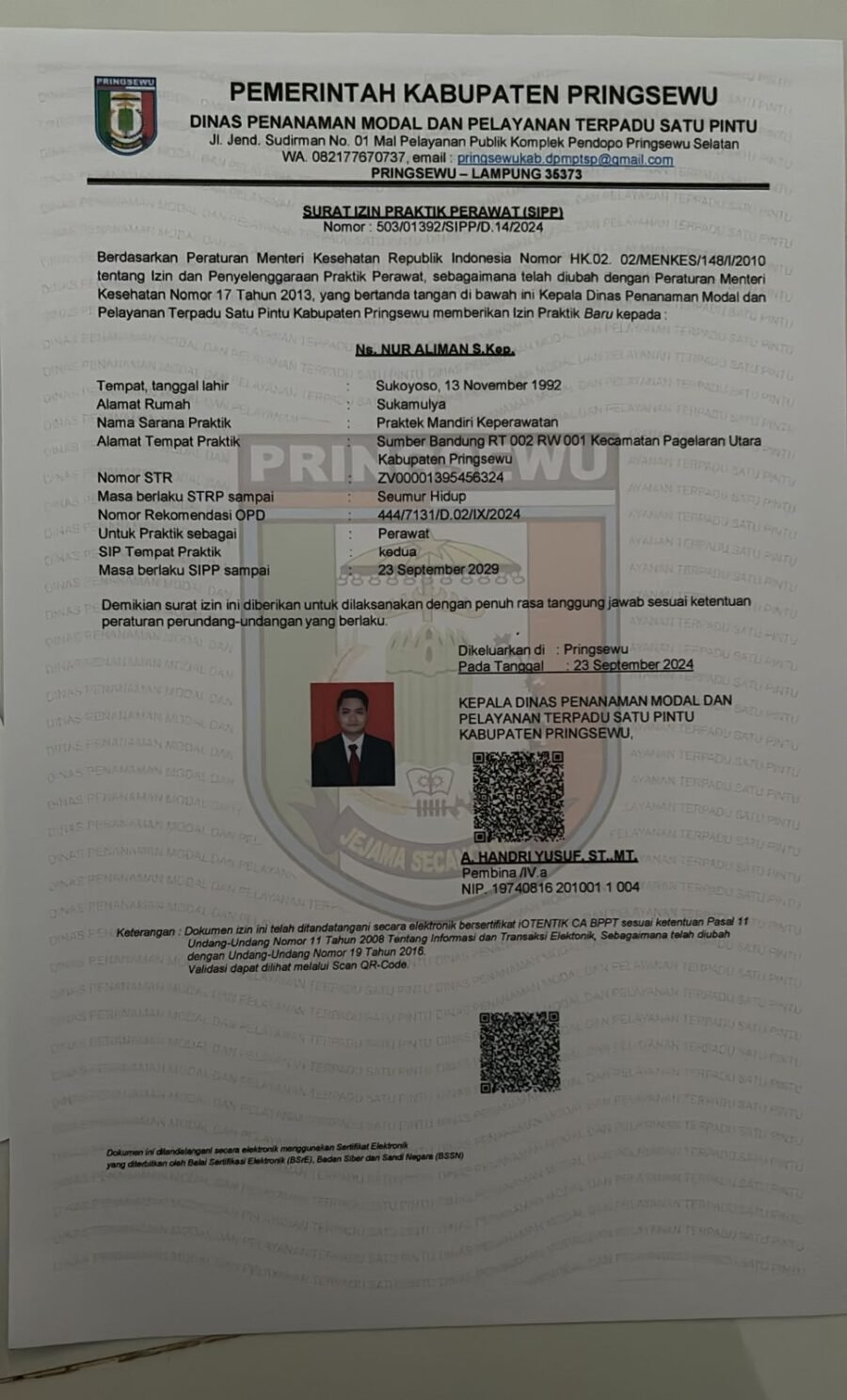 Pringsewu (Netizenku.com): Salah satu perawat di Kabupaten Pringsewu, Ns. Nur Aliman S.Kep, telah mengantongi SIPP dengan nomor 503/01392/SIPP/D.14/2024.