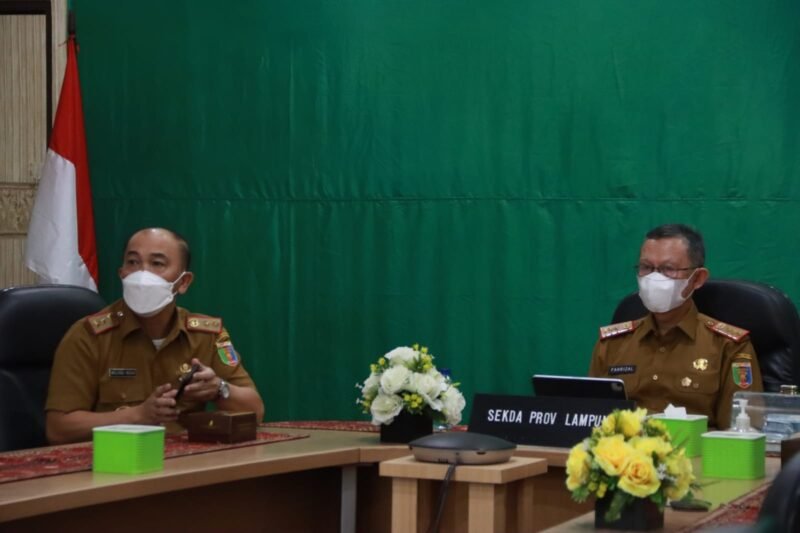 Bandar Lampung — Sekretaris Daerah Provinsi Lampung Fahrizal Darminto, menghadiri Rapat Koordinasi Terbatas Evaluasi PPKM untuk optimalisasi penanganan pandemi dan vaksinasi secara virtual, di Ruang Command Center Lt.2 Diskominfotik Provinsi Lampung, Selasa (15/02)