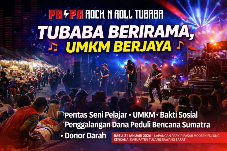 Denting nada dan denyut ekonomi rakyat akan bertemu dalam satu panggung kebersamaan. Komunitas Papa Rock n Roll, wadah para musisi di Kabupaten Tulangbawang Barat (Tubaba), akan menggelar kegiatan bertajuk “Tubaba Berirama, UMKM Berjaya” pada Rabu malam, 21 Januari 2026, di halaman parkir Pasar Modern Pulung Kencana. Acara ini terbuka untuk umum dan dapat dinikmati tanpa tiket masuk.
