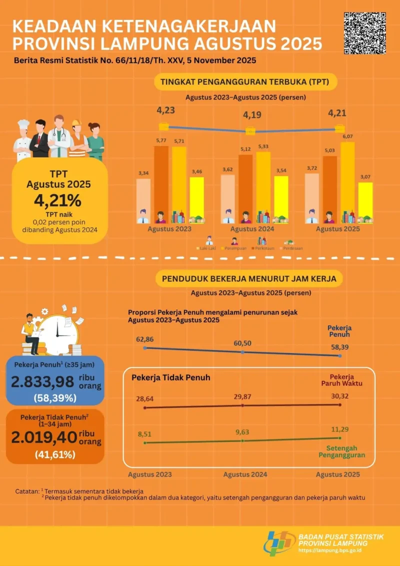 BANDARLAMPUNG — Badan Pusat Statistik (BPS) Provinsi Lampung mencatat Tingkat Pengangguran Terbuka (TPT) Agustus 2025 sebesar 4,21 persen, naik tipis 0,02 persen poin dibandingkan Agustus 2024 yang sebesar 4,19 persen. Meski mengalami sedikit kenaikan, angka ini tetap lebih rendah dari rata-rata nasional dan mencerminkan stabilitas pasar kerja daerah di tengah dinamika ekonomi dan perubahan pola kerja pascapandemi.
