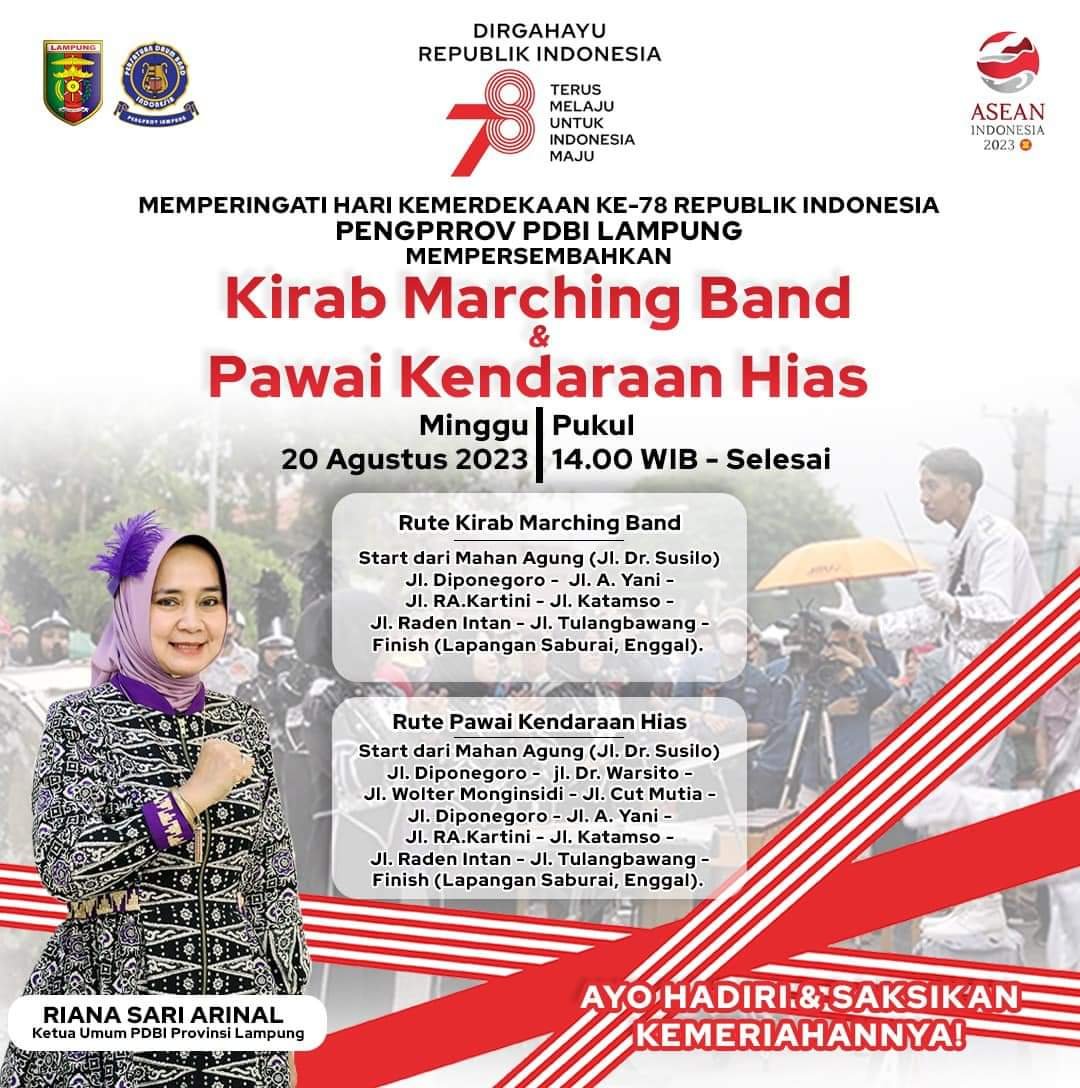 Jadi, jangan lewatkan keseruan acara Kirab Marching Band dan Pawai Kendaraan Hias pada hari Sabtu, 20 Agustus 2023, di Kota Bandar Lampung. Mari bersama-sama merayakan semangat kemerdekaan RI yang ke-78 dengan sukacita dan kegembiraan. (Luki)
