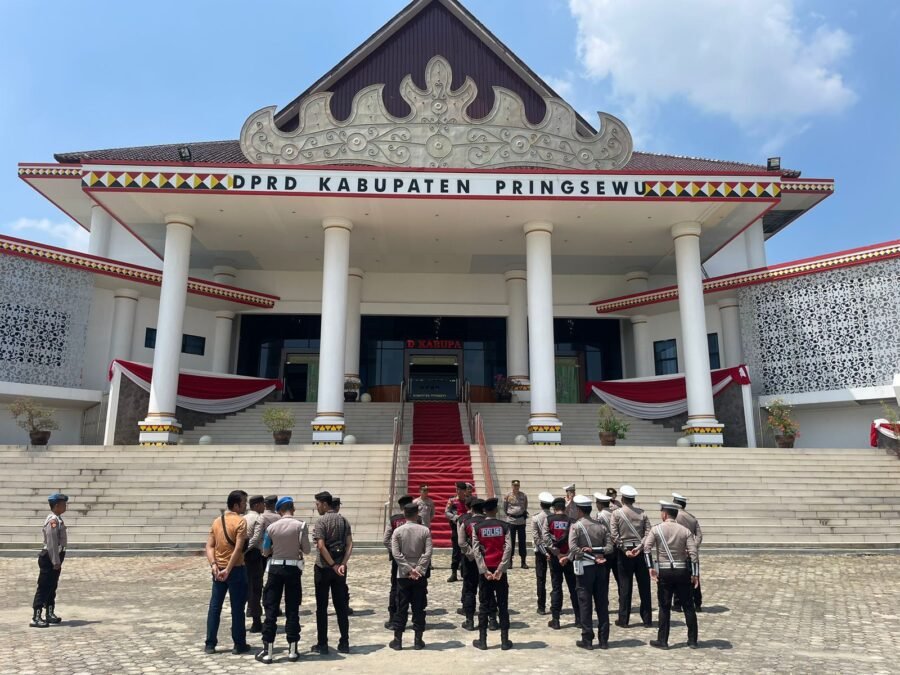 Pringsewu (Netizenku.com): Sidang Paripurna pengambilan sumpah anggota DPRD Kabupaten Pringsewu masa bakti 2024-2029 yang digelar di Kantor DPRD Kabupaten Pringsewu, Senin (19/8/2024) siang berlangsung dengan pengamanan ketat. Ratusan aparat gabungan dari kepolisian, TNI, Satpol-PP, dan Dinas Perhubungan bersiaga di berbagai titik strategis, baik di dalam maupun luar gedung DPRD.