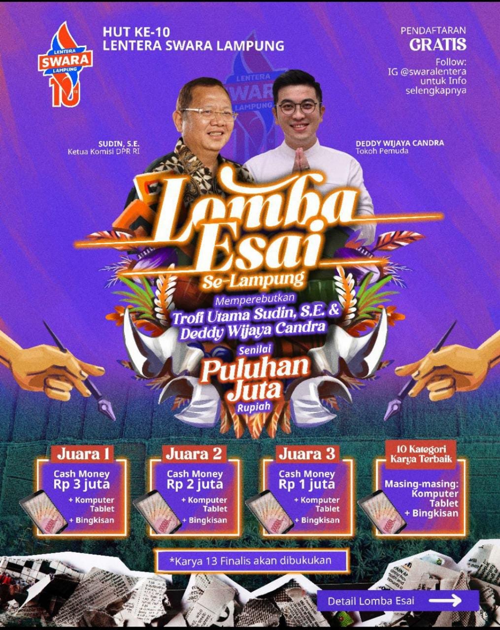 “Ketentuannya, wajib follow IG @Swaralentera dan @Bung.deddy. Pedoman lengkap lomba menulis esai ada di platform media sosial kami di instagram. Peserta berdomisili di Lampung dengan minimal usia 17 tahun, karya orisinil dan belum pernah dipublikasikan, serta akan dipilih 13 finalis dari peserta lomba,” jelas Wahyu Indarto, Selasa (8/11).