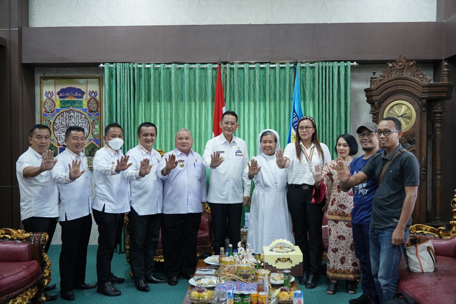 Pringsewu (Netizenku.com): Pj Bupati Pringsewu Adi Erlansyah, menerima kunjungan audiensi Relawan Jaringan Masyarakat Menentang Perdagangan Orang (JMMPO). Perwakilan relawan tersebut diantaranya Sr. M.Katarina, FSGM, Ririn Nang Abidin Hasan, Berta Niken, Mamat dan Agista yang diterima oleh Pj. Bupati Pringsewu didampingi Asisten Perekonomian dan Pembangunan Drs.Masykur, M.M., Kadis P3AP2KB Drs.Nang Abidin Hasan, Kadis Tenaga Kerja dan Transmigrasi Johndrawadi, S.E., M.M., Kadis Kesehatan dr.Ulinoha dan Kabag Kesra Rustiyan, S.Pd. di ruang kerja Bupati Pringsewu, kamis (16/02).