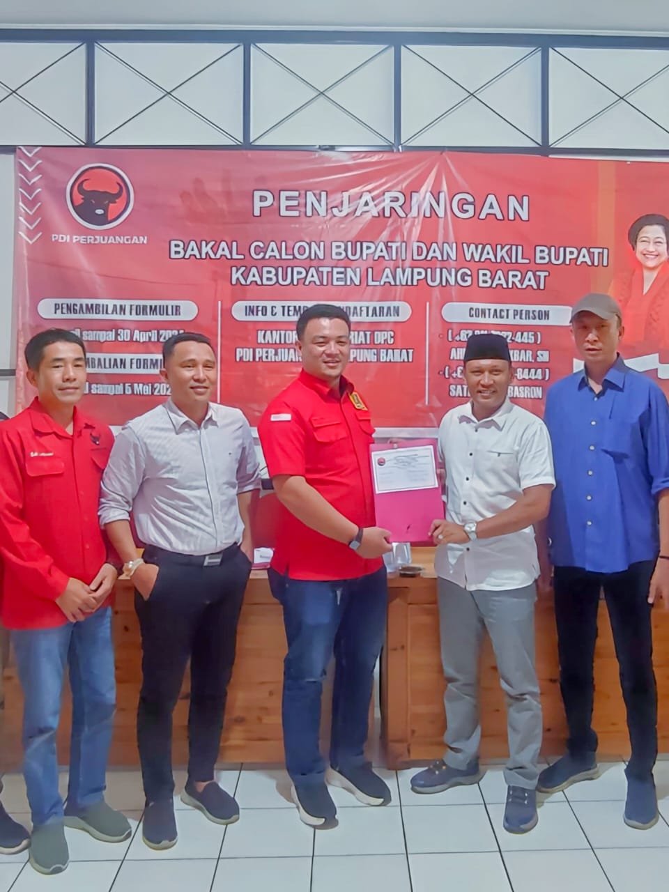 Liwa (Netizenku.com): Selain dinyatakan lengkap, berkas pencalonan Bambang Kusmanto sebagai bakal calon wakil bupati di DPC PDI Perjuangan terasa istimewa, pasalnya ia disambut langsung Ketua dan Sekretaris DPC PDI Perjuangan Lampung Barat, Parosil Mabsus dan Edi Novial.