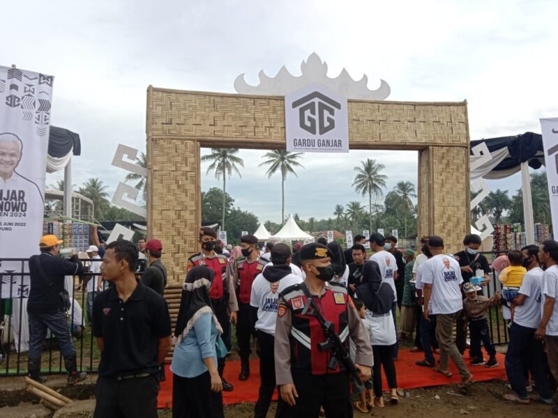Pringsewu (Netizenku.com): Ratusan aparat gabungan diterjunkan untuk mengamankan aksi relawan Gerakan Rakyat Desa Untuk Ganjar Pranowo (Gardu Ganjar) yang mendeklarasikan dukungan untuk maju sebagai presiden pada Pemilu 2024 yang digelar di Lapangan Pekon Totokarto, Adiluwih, Pringsewu, Lampung, Minggu (26/6).