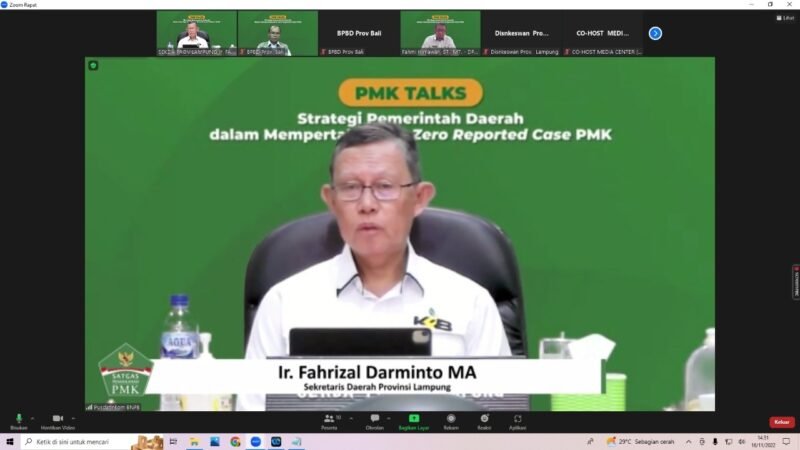 Bandarlampung (Netizenku): Sekretaris Daerah Provinsi Lampung, Fahrizal Darminto, menjadi narasumber pada Acara Talkshow dengan Tema “Strategi Pemerintah Daerah Dalam Mempertahankan Zero Reported Case PMK,” melalui Virtual Meeting, yang dilaksanakan Badan Nasional Penanggulangan Bencana (BNPB) RI bertempat di Ruang Command Center Lt.II Diskominfotik Provinsi Lampung, Rabu (16/11/2022).