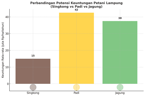 Singkong: produktivitas 20–25 ton/ha, harga jual Rp900–Rp1.200/kg, keuntungan bersih Rp10–20 juta/ha/tahun.