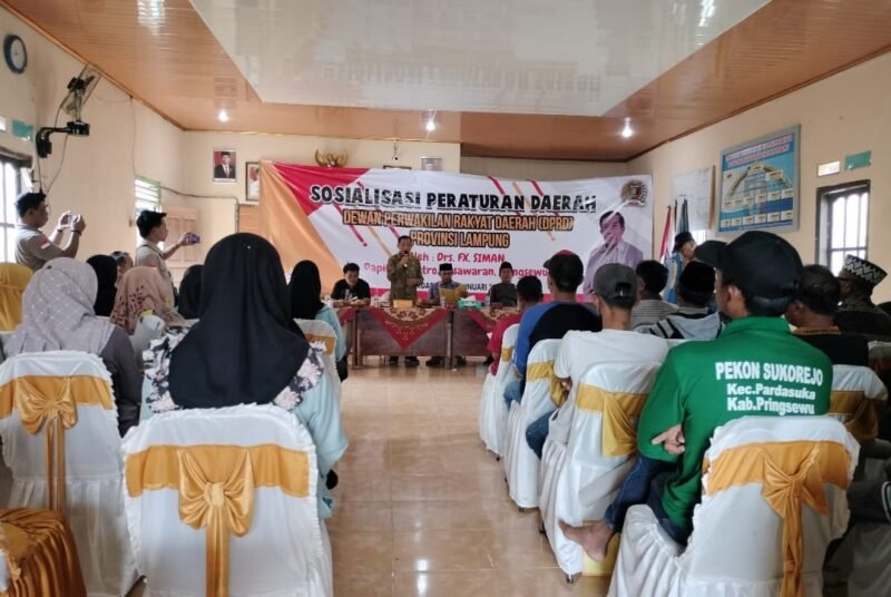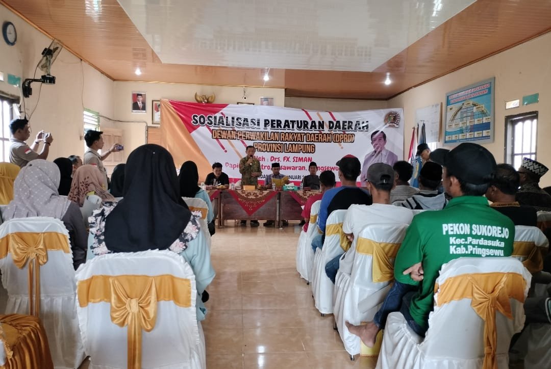 “Sosperda ini disampaikan Agar Tidak Terjadi Konflik dan Utamakan Musyawarah dalam penyelesaian masalah,” kata Anggota Komisi III DPRD Lampung, FX. Siman, saat menggelar Sosialisasi Peraturan Daerah Provinsi Lampung Nomor 1 Tahun 2016 tentang Pedoman Rembug Desa dan Kelurahan dalam Pencegahan Konflik di Provinsi Lampung, dihadapan masyarakat Pekon Sukorejo, Kecamatan Pardasuka, Pringsewu. Sabtu (28/01).