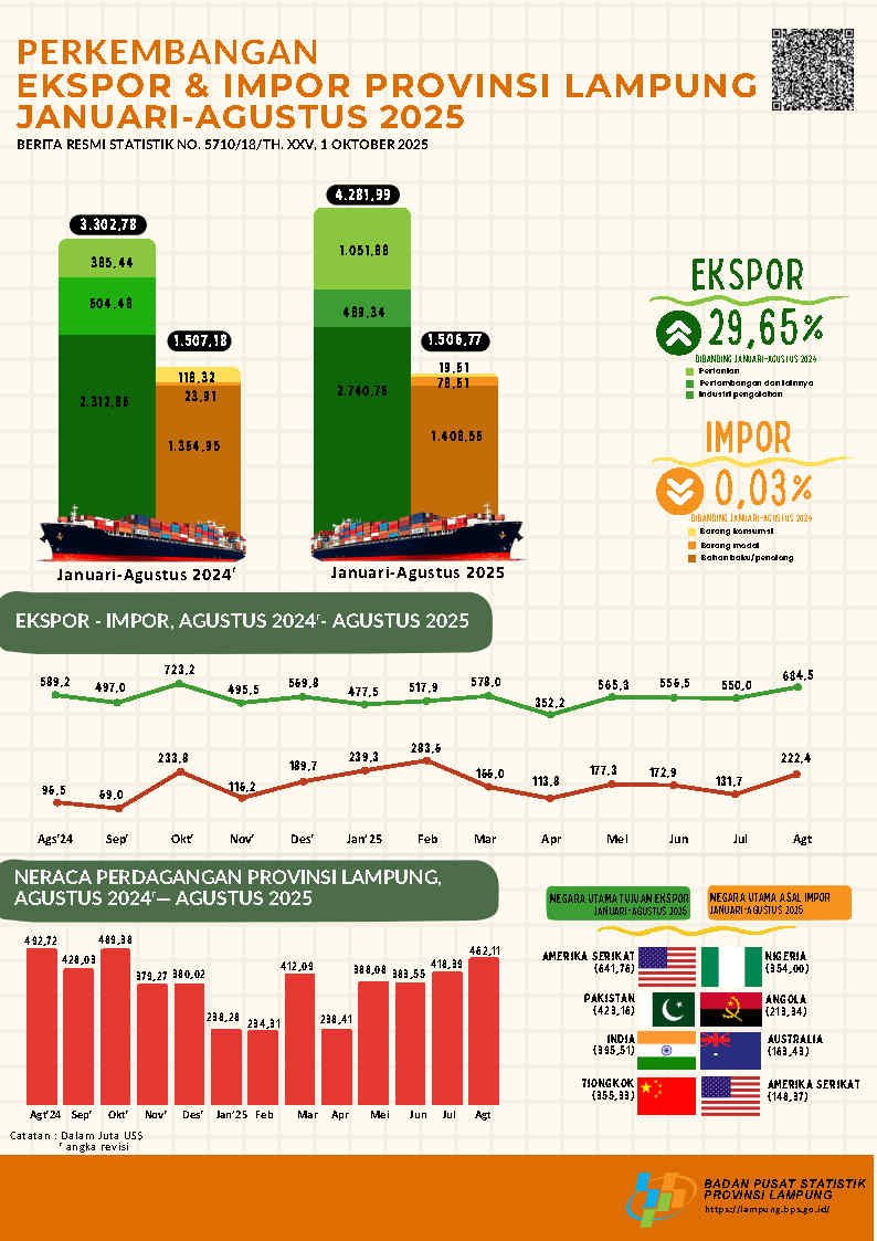 Neraca perdagangan Lampung kembali mencatat kinerja impresif pada Agustus 2025. Badan Pusat Statistik (BPS) Lampung merilis nilai ekspor periode Januari–Agustus 2025 mencapai US$4,28 miliar, naik 29,65% dibanding periode sama tahun sebelumnya. Sementara impor tercatat US$1,51 miliar, relatif stagnan karena hanya turun tipis 0,03%. Dengan demikian, Lampung membukukan surplus dagang sebesar US$2,77 miliar, capaian yang menegaskan posisi provinsi ini sebagai salah satu motor perdagangan nasional.
