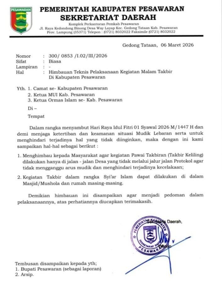 Pemerintah Kabupaten Pesawaran mengimbau masyarakat agar tidak melaksanakan pawai takbiran atau takbir keliling di jalan protokol saat menyambut Hari Raya Idul Fitri 1 Syawal 1447 Hijriah/2026 Masehi.
