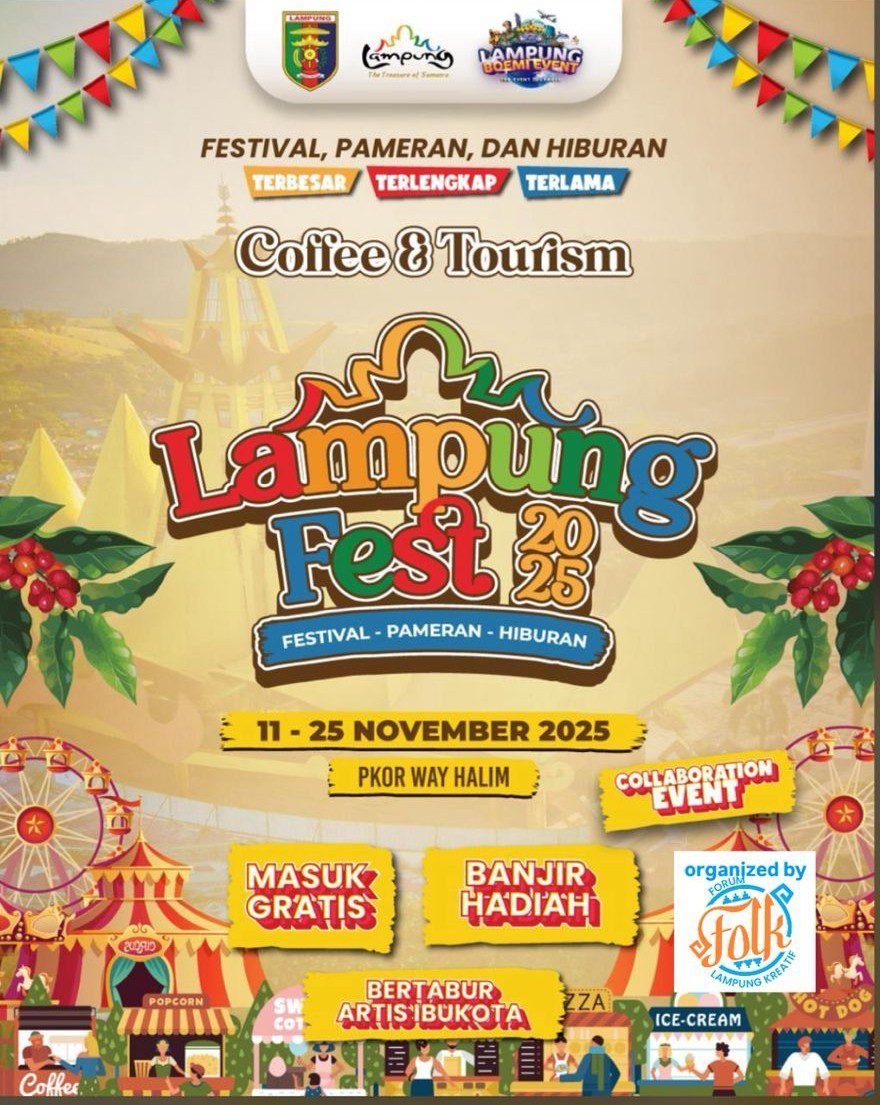 Lampung Fest 2025 akan digelar pada 11–25 November di PKOR Way Halim, Bandar Lampung. Dengan format baru, festival ini menjadi panggung kolaborasi masyarakat, komunitas kreatif, dan dunia usaha untuk menggerakkan pariwisata Lampung.