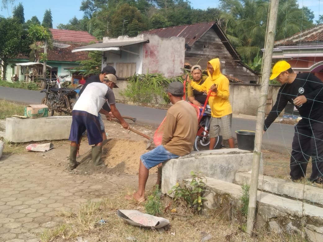 Asep Kosasih selaku Kepala Pekon Tanjung Gunung dengan antusias terjun langsung bekerja mengaduk semen menambal talut-talut yang bocor dan membersihkan sampah-sampah yang ada di jalur Siring.